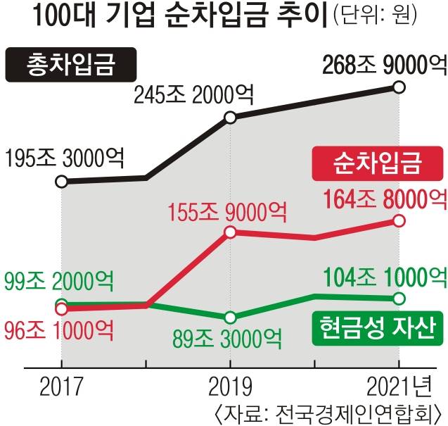 하지만 호실적을 받아 든 기업들은 차입을 늘려 현금을 확보하는 데 주력하고 있다. 100대 기업의 순차입금(총차입금에서 현금성 자산을 뺀 값)은 지난해 말 164조 8000억원으로 최근 5년 내 최대치를 찍었다. 기업들의 순차입금 규모는 2017년부터 꾸준히 증가세를 이어 가고 있다.