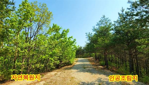 | ▲ 임도를 사이에 두고 활엽수가 저절로 자란 자연복원지와 소나무를 인공조림한 곳으로 구분되어 있는 고성 산불 현장. |