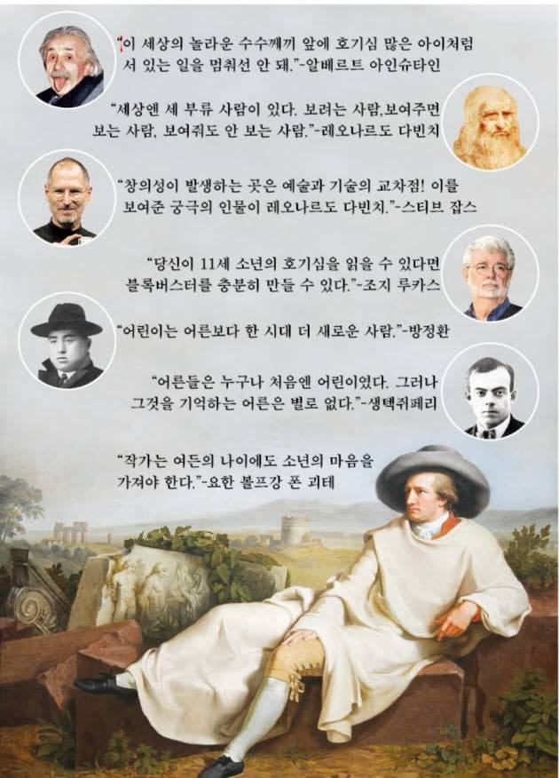 괴테의 호기심은 어릴 때부터 유별났다. 새의 깃털이 날개에 어떻게 붙어 있는지 살펴보려고 깃털을 하나씩 뽑아봤다. 꽃잎 받침대의 상태가 궁금할 땐 꽃잎을 한 잎씩 뜯어가며 관찰했다. 이는 노년에 이를 때까지 남다른 창의력과 상상력의 원천이 됐다. “작가는 여든의 나이에도 소년의 마음을 가져야 한다”는 명언이 그 속에서 나왔다.