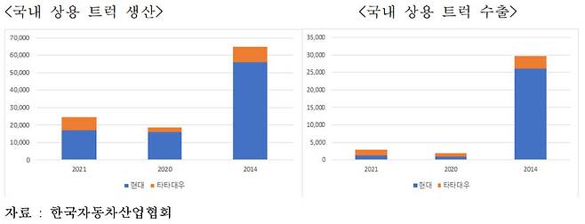 하지만 국내 자동차 산업에서 차지하는 상용차 산업의 위상은 갈수록 낮아지고 있다. 국내 자동차 생산은 2011년부터 2015년까지 완만하게 감소하다가 2016년 이후 2021년까지 빠르게 감소했다. 2015~2020년 중 세계 자동차 수요가 18.6% 줄었는데 국산차 내수 판매는 정부의 개별 소비세 인하에 힘입어 1.4% 증가했다. 국산 승용차 판매가 이 기간에 3.6% 늘어난 반면 상용차 수요는 9.9% 줄었다.