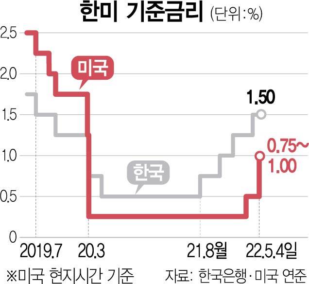 미국이 강도 높은 통화 긴축의 시작을 알리는 ‘빅스텝(기준금리를 한 번에 0.5%포인트 인상)’의 첫발을 떼면서 한국은행의 금리 인상 시계도 빨라지게 됐다. 미국 중앙은행이 두세 차례의 추가 빅스텝을 예고한 만큼 우리도 금리 인상에 속도를 내지 않을 경우 이르면 7월 한미 금리가 역전되는 상황이 벌어질 수도 있기 때문이다. 미국의 금리 수준이 한국보다 높아지면 외국인 자본 유출과 원화 가치 하락에 따른 추가 물가 상승 등 경제 불안 요인으로 작용할 수 있다. 이를 반영해 한은이 이달 26일 금융통화위원회에서 두 달 연속 금리 인상 결정에 이어 하반기 두세 차례 추가 인상에 나설 것이라는 관측이 빠르게 확산하고 있다.