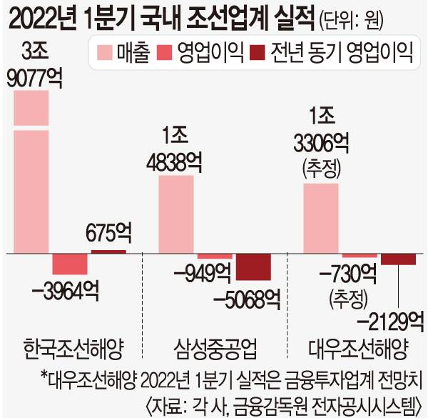 5일 조선업계에 따르면 조선 빅3(한국조선해양, 대우조선해양, 삼성중공업)는 올해 1분기 약 5700억원 규모의 영업손실을 기록할 전망이다. 지난해 말부터 LNG선 같은 친환경 선박을 대량으로 수주하면서 ‘호황 사이클’에 올라탔다는 평가와 사뭇 다른 성적표다. 조선업계는 철강재를 포함한 원자재 가격이 폭등하면서 공사손실충당금으로 건조 비용을 충당하느라 손실이 이어진다고 설명한다.