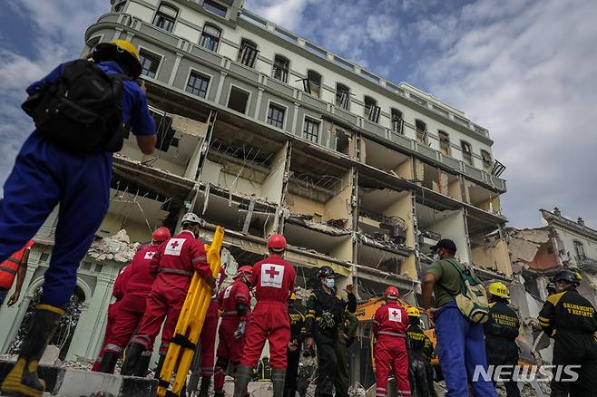 [아바나=AP/뉴시스] 6일(현지시간) 쿠바 수도 아바나에서 적십자 대원들과 구조대가 5성급 호텔 '사라토가' 폭발 현장에 진입할 준비를 하고 있다. 가스 누출로 추정되는 강력한 폭발로 임산부와 어린이 등 최소 18명이 숨지고 수십 명이 다쳤다. 폭발 당시 호텔은 공사 중이어서 투숙객은 없었던 것으로 알려졌다. 2022.05.07.