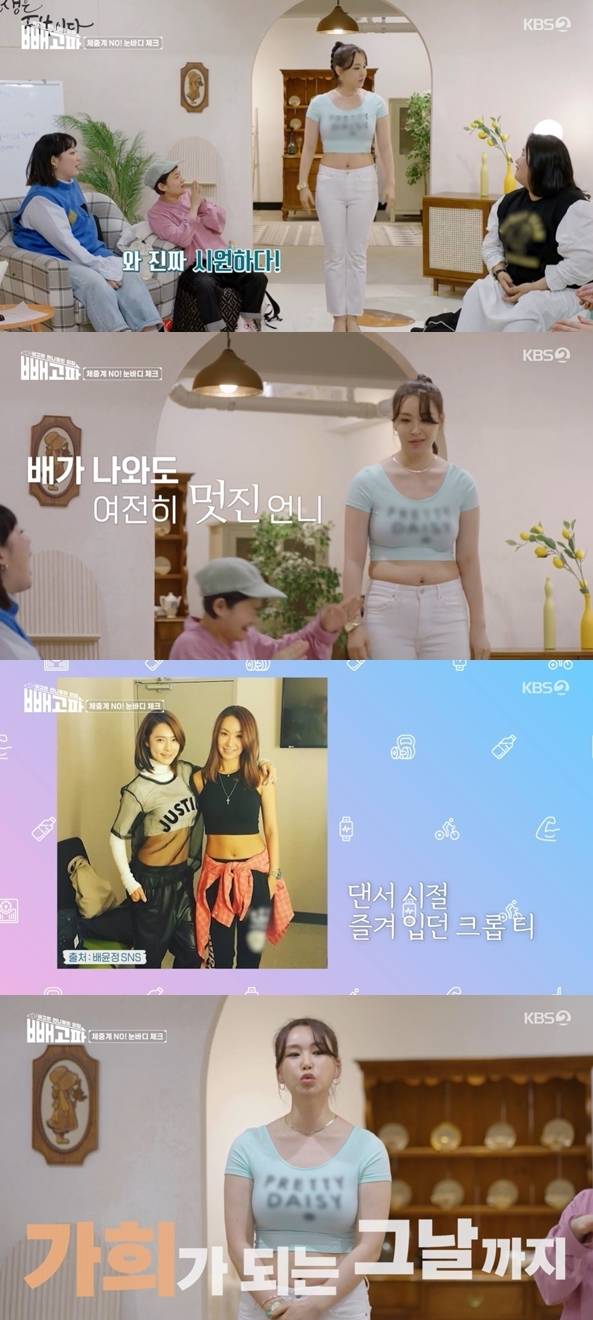 "힘 빼도 될까요"라는 말과 함께 배윤정의 크롭티 밑으로는 볼록한 뱃살이 자리했다.