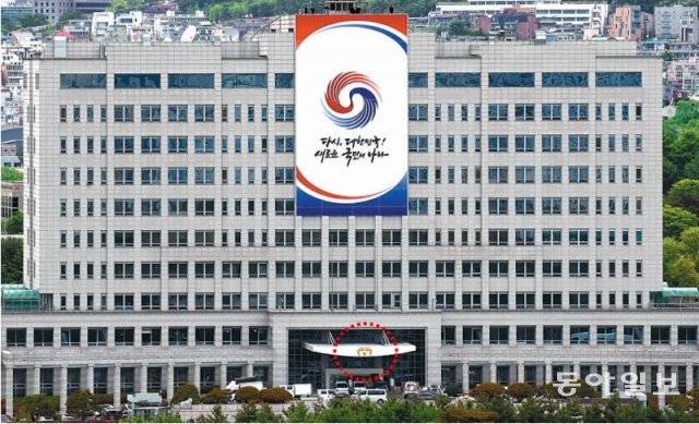 국방부 마크 대신 봉황 장식… ‘용산 대통령실 시대’ 내일 개막 윤석열 대통령 당선인 취임식을 이틀 앞둔 8일 대통령 집무실로 쓰일 서울 용산 국방부 신청사에 대통령을 상징하는 봉황 장식(점선 안)과 ‘다시, 대한민국! 새로운 국민의 나라’라고 쓰인 취임 기념 현수막이 설치됐다. 홍진환 기자 jean@donga.com