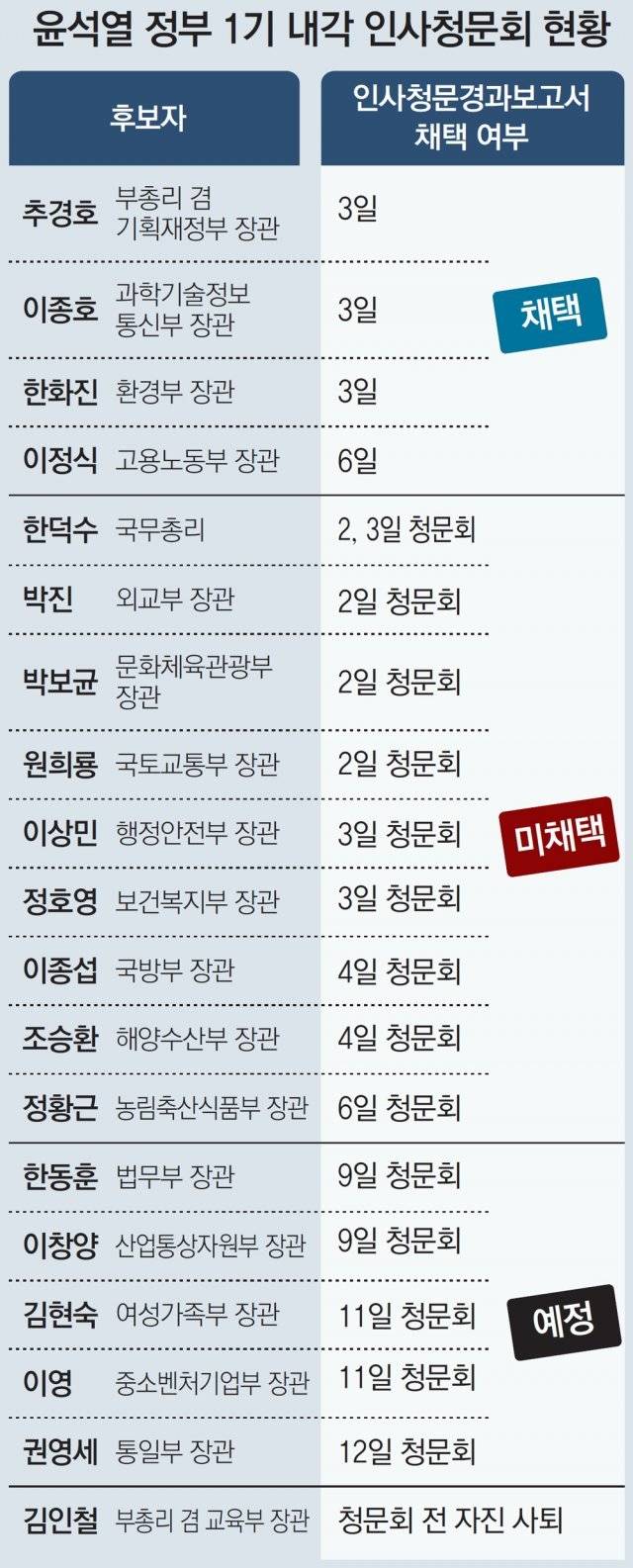 여기에 극심한 여야 대치 국면의 출구가 보이지 않는다는 점도 임명 강행 기류에 무게가 실리는 배경으로 꼽힌다. 윤 당선인 측 관계자는 “한 후보자 사례에서 볼 수 있듯 민주당의 발목 잡기가 도를 넘고 있다”며 “김인철 사회부총리 겸 교육부 장관 후보자가 사퇴한 이후 달라진 것이 있느냐”고 했다.