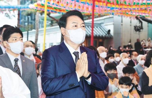 尹, 부처님오신날 조계사 법요식 참석 윤석열 대통령 당선인이 8일 서울 종로구 조계사에서 열린 부처님오신날 법요식에 참석해 합장하고 있다. 윤 당선인은 축사를 통해 “국민 마음을 하나로 모으고 어려운 이웃들을 더욱 따뜻하게 보살피겠다”고 했다. 인수위사진기자단
