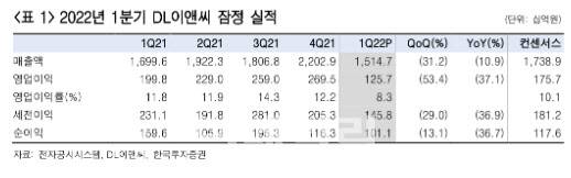 그는 매출액은 세 가지 이유 때문에 부진했다고 분석했다. 먼저, 공정을 진행 중인 현장 수에 비해 별도 기준 주택 매출액이 부진했고 중대재해법 시행 전후로 원활하게 현장을 운영하지 못한 것으로 파악했다. 이어 강 연구원은 “러시아 프로젝트 매출화 차질로 별도 기준 플랜트 매출액이 전년 동기 대비 53% 감소한데다 연결 자회사인 DL건설의 매출액이 전년동기대비 20% 감소했다”면서 “지난해 도시정비 현장 준공 후 주택 매출에 일시적으로 공백이 생겼기 때문”이라고 지적했다.