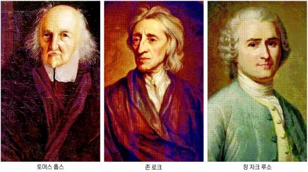 사회계약설은 세 갈래로 나뉩니다. 토머스 홉스(1588~1679)의 사회계약설, 존 로크(1632~1704)의 사회계약설, 장 자크 루소(1712~1778)의 사회계약설이 그것입니다. 셋 다 모두 계약설이라는 점에선 동일하지만, 계약의 이유를 조금씩 다르게 설명합니다.