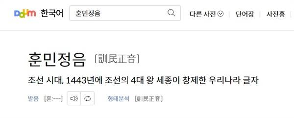 <다음> 한국어 사전은 2009년에 고려대 민족문화연구원에서 발행한 <고려대 한국어대사전> 종이 사전을 바탕으로 한 것이므로, '훈민정음'에 대한 뜻풀이를 13년 만에 바꾼 셈이다. 이제 초중고 국어 교과서와 역사 교과서도 세종 단독 창제로 바꾸었으므로, 늦었지만 잘 된 일이다. <보리 국어사전>에 이어 기자의 제안을 받아들여 훈민정음 뜻풀이를 고친 두 번째 사전이다.
