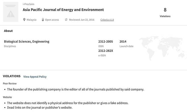 문제는 “Engineering International”이라는 학술지 역시, 약탈적 학술지로 카벨 블랙리스트에 등재돼 있다는 점이다. 카벨은 이 저널에 대해 “출판사의 설립자가 출판하는 모든 저널의 편집자도 맡고 있다”고 지적했다. 즉, 한 사람이 모든 논문을 심사한다는 뜻이다. 그만큼 논문은 부실하게 심사할 수 밖에 없다. 국제 저널이라고 주장하지만 저자들의 지리적 다양성이 확보되지 않았다는 점도 지적하고 있다.
