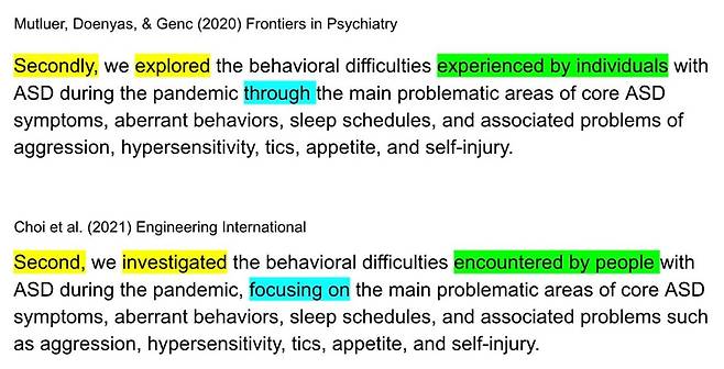 뉴스타파가 확인한 결과, 문제의 논문은 2020년 11월 터키 한 대학병원의 교수와 연구자들이 “프론트 사이키아트리”(Front Psychiatry 2020)에 게제한 논문, " Behavioral Implications of the Covid 19 Process for Autism Spectrum Disorder, and Individuals' Comprehension of and Reactions to the Pandemic Conditions”의 초록과 서론, 연구 결과, 결론까지 베낀 것으로 드러났다. 논문 표절 프로그램(Copyleaks)의 검증 결과, 표절률은 76%였다. 전체 5,108개 단어 중 3,884개 단어가 표절 의혹을 받았다.
