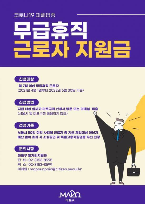 자세한 사항은 마포구청 무급휴직 근로자 지원금 접수처로 문의하면 된다.