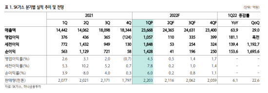 SK가스의 올해 1분기 매출액은 전년 대비 63.9% 증가한 2조4000억원을 기록했다. 유가 상승으로 인한 판매가격 상승과 판매실적 개선이 영향을 줬다. 판매량은 상대적 가격 경쟁력이 높아지면서 크게 증가했다. 또 해외 트레이딩 물량이 개선되는 상황에서 대리점 및 산업체 공급량도 늘어났다.