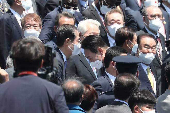 14년 전 한덕수 총리의 역할을 오늘은 김부겸 총리가 한 셈인데요, 김 총리가 식사를 낭독할 때 한덕수 후보자는 내빈석에 앉아 듣고 있었네요. 취임식 말미에 윤 대통령이 한덕수 후보자와 인사를 나누는 모습이 포착되기도 했죠.