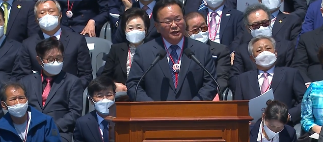 김부겸 국무총리는 취임식에서 식사를 낭독했는데요, 국무총리가 새 정부 출범에 대해 축하 인사하는 관례를 따른 거죠. 인사말이 길지는 않아요. 퇴임하는 문재인 대통령에게 감사와 존경을 표하고 "윤석열 정부가 국민의 뜻을 하나로 모으고 대한민국의 무궁한 발전을 이어나가기를 온 국민과 함께 기원한다"는 내용이죠.
