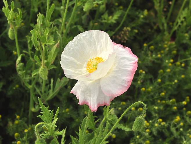 꽃양귀비, 수레국화, 안개꽃 등이 각각의 아름다움을 드러내며 피어있다.