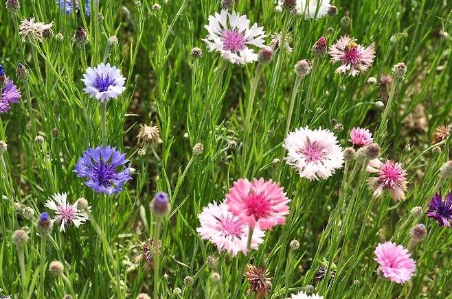 | ▲ 국화과인 수레국화는 1-2년생으로 파랑, 주황, 붉은 색, 흰색의 꽃이 핀다. |