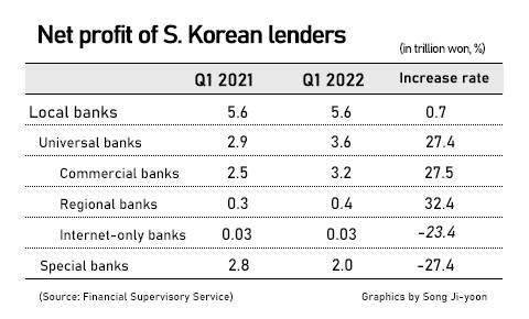 Korean lenders generated 5.6 trillion won ($4.4 billion) in net income from January to March this year, up 0.7 percent from a year ago, according to the Financial Supervisory Service (FSS) on Wednesday.