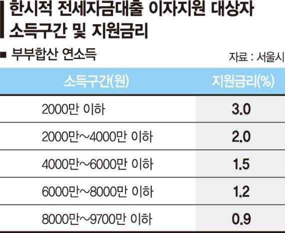 서울시는 세입자 부담을 덜기 위해 8월부터 계약갱신요구권이 만료돼 신규로 전세 계약하는 저소득 가구에 대출한도 최대 3억원의 최대 연 3%대(본인 부담 최소금리 1% 이상)로 이자를 지원할 계획이다. 임대차 2법 시행 이후 계약갱신요구권을 행사해 오는 8월부터 내년 7월 사이 갱신 계약이 만료되는 무주택 임차인이 대상이다. 최장 2년까지 한시적 지원하며, 소득구간별로 금리를 차등적용해 저소득 가구일수록 더 많은 이자를 지원한다.