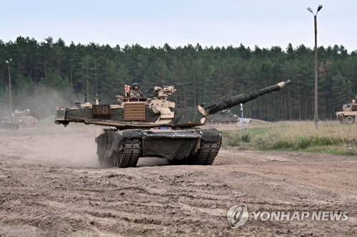 epa09940266 Abrams tanks from the US 4th Infantry Division from Colorado during combat shooting at the training ground in Drawsko Pomorskie, Poland, 11 May 2022. The international exercise Defender Europe 2022, which is an allied, cyclical exercise organized by the American military, is underway at many European training grounds. EPA/Marcin Bielecki POLAND OUT