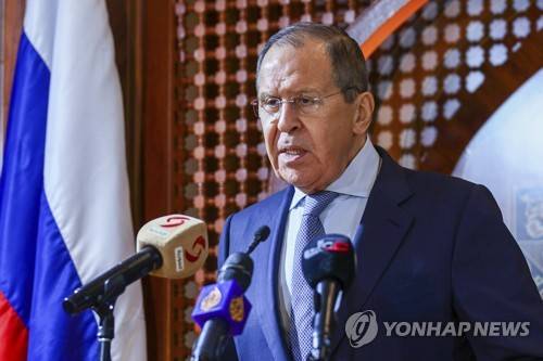In this handout photo released by Russian Foreign Ministry Press Service, Russian Foreign Minister Sergey Lavrov speaks to the media during a joint news conference with Omani Foreign Minister Sayyid Badr Albusaidi following their talks in the capital Muscat, Oman, on Wednesday, May 11, 2022. (Russian Foreign Ministry Press Service via AP) AP PROVIDES ACCESS TO THIS PUBLICLY DISTRIBUTED HANDOUT PHOTO PROVIDED BY RUSSIAN FOREIGN MINISTRY PRESS SERVICE ; MANDATORY CREDIT.
