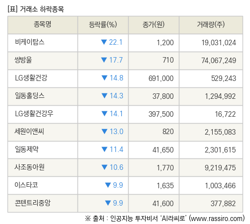 12일 거래소 기준으로 하락한 종목은 비케이탑스(030790) -22.1%, 쌍방울(102280) -17.7%, LG생활건강(051900) -17.7% 등이 있다.