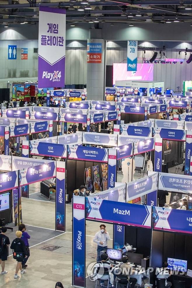 (수원=연합뉴스) 게임의 현재와 미래를 한 번에 만날 수 있는 수도권 최대 규모의 융복합 게임쇼 '2022 플레이엑스포'(PlayX4)가 12일 고양시 킨텍스에서 개막했다. 사진은 관람객들이 게임을 체험하는 모습. 2022.5.12 [경기도 제공. 재판매 및 DB 금지]