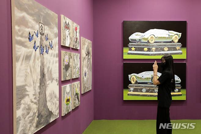 [부산=뉴시스] 박진희 기자 = 제11회 아트부산 개막을 하루 앞둔 12일 부산 벡스코에서 열린 VIP 사전관람 행사에 참석한 관람객들이 전시 작품을 감상하고 있다. 올해 아트부산에는 국내외 최정상 갤러리 125곳(국내 97곳, 해외 28곳)이 참여할 예정이며, 내일부터 15일까지 부산 벡스코에서 개최한다. 2022.05.12. pak7130@newsis.com