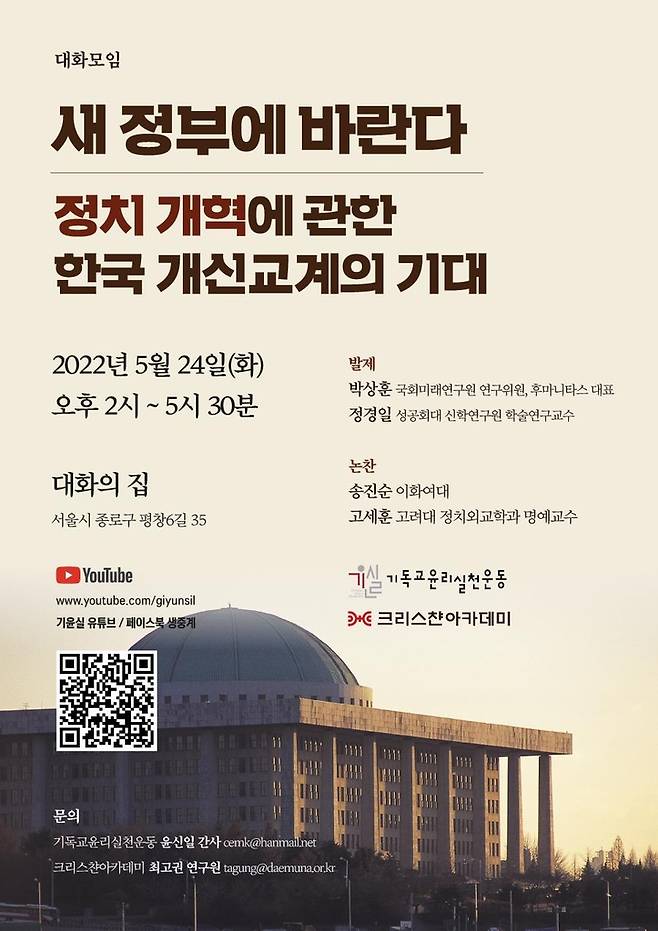 ▲ 기윤실·크리스챤아카데미, '尹정부 정치개혁' 주제 대화모임 = 개신교계 시민단체인 기독교윤리실천운동(이하 기윤실)과 크리스챤아카데미는 24일 오후 2시 서울 종로구 평창동 대화의집에서 '새 정부에 바란다-정치 개혁에 관한 한국 개신교계의 기대'를 주제로 대화모임을 연다.