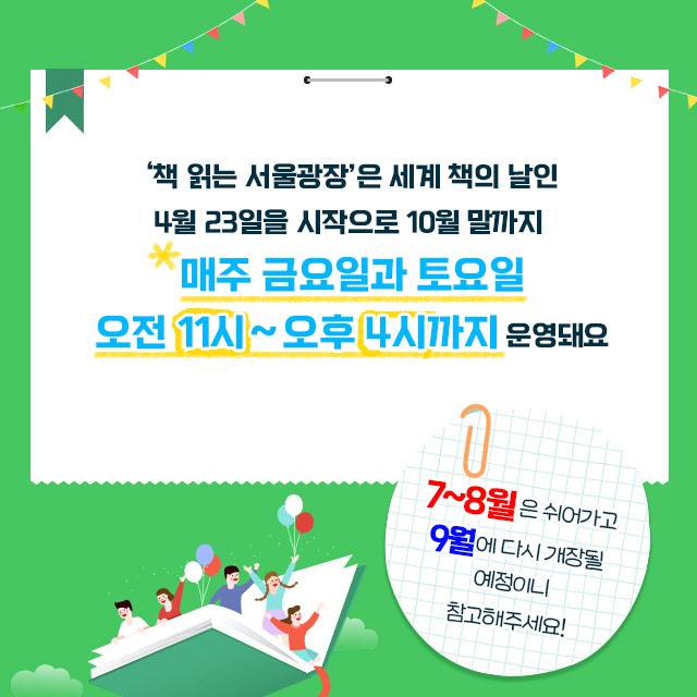 ‘책 읽는 서울광장’은 세계 책의 날인 4월 23일을 시작으로 10월 말까지 매주 금요일과 토요일 오전 11시부터 오후 4시까지 운영돼요.