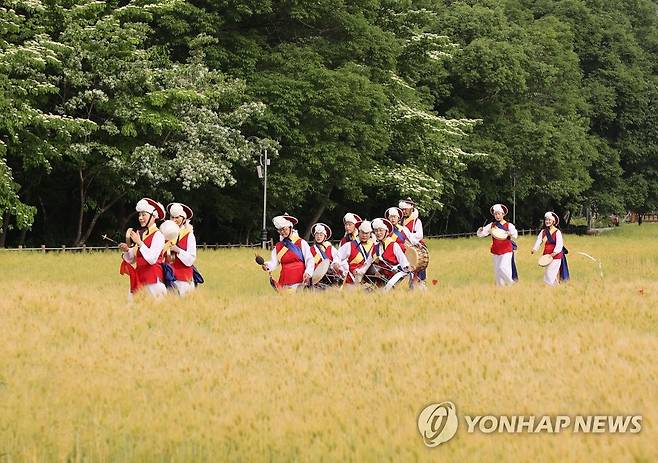 (서울=연합뉴스) 13일 오전 경남 함양군 함양읍 상림공원 청보리밭에서 다볕풍물패 회원들이 길놀이를 하고 있다. 2022.5.13 [함양군 제공. 재판매 및 DB 금지]