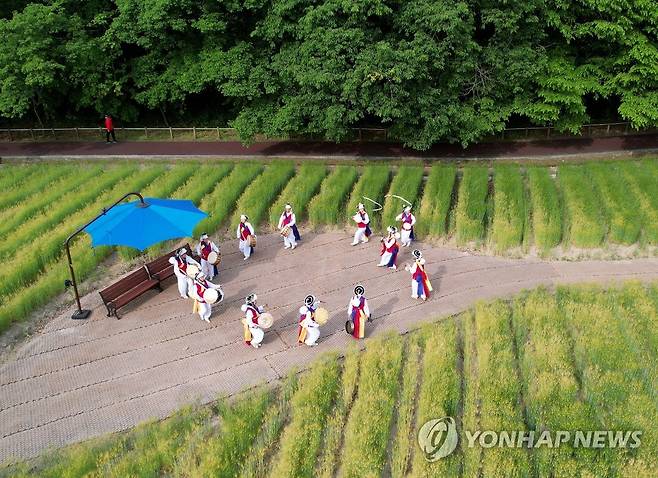 (서울=연합뉴스) 13일 오전 경남 함양군 함양읍 상림공원 청보리밭에서 다볕풍물패 회원들이 길놀이를 하고 있다. 2022.5.13 [함양군 제공. 재판매 및 DB 금지]