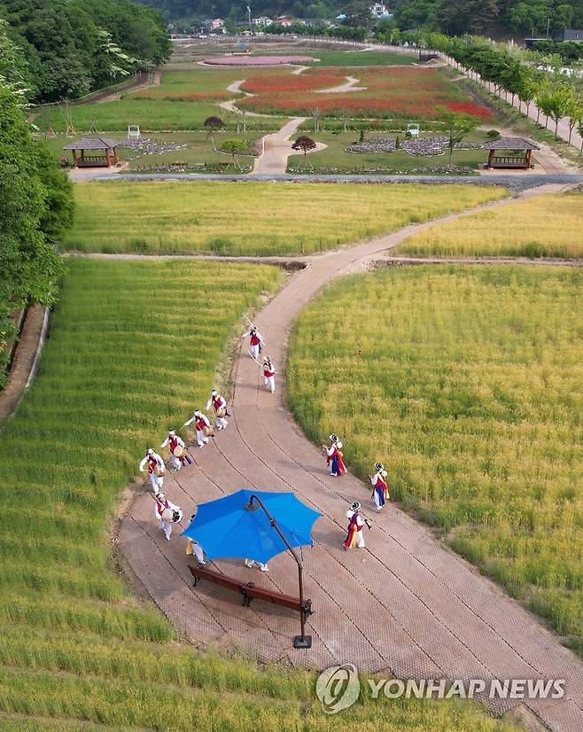 (서울=연합뉴스) 13일 오전 경남 함양군 함양읍 상림공원 청보리밭에서 다볕풍물패 회원들이 길놀이를 하고 있다. 2022.5.13 [함양군 제공. 재판매 및 DB 금지]