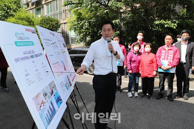 [이데일리 노진환 기자] 오세훈 국민의힘 서울시장 후보가 13일 서울 서대문구 세검정로의 한 아파트 단지에서 ‘서울형 고품질 임대주택 관련 발표’를 하고 있다.