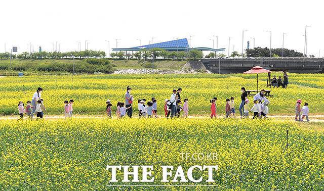 [더팩트ㅣ인천=남용희 기자] 하늘정원이 무료 개방을 시작한 13일 오전 인천 중구 운서동 인천공항 하늘정원을 찾은 아이들이 유채꽃을 감상하며 즐거운 시간을 보내고 있다.