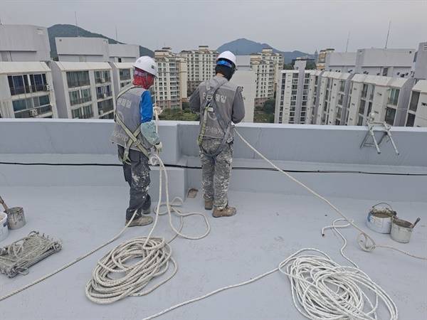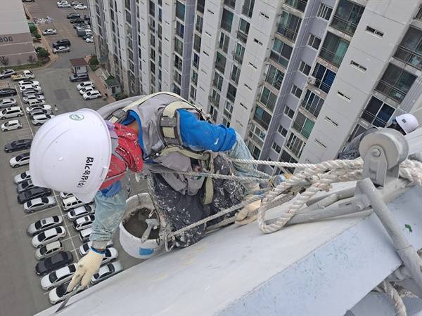 | ▲ 이정환씨와 동료가 아파트 옥상에 밧줄을 고정한 후 밧줄을 내리고 있다. 아파트 외벽 도장작업은 2인 1조로 이루어진다. |