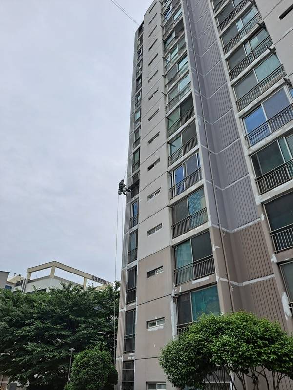 | ▲ 아파트에 페인트를 칠하기 전 외벽 갈라진 틈을 퍼티(putty)로 채워주는 기초작업 중이다. |