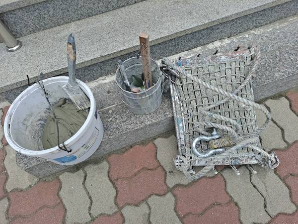 | ▲ 아파트 외벽 도장작업에 사용될 작업 도구와 재료 및 달비계다. |