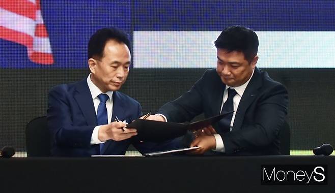 박찬윤 AGBA 총재(왼쪽), 김민석 온페이스게임즈 대표가 13일 서울 여의도 콘래드호텔에서 온페이스게임즈&미국연합상업협회, 나스닥 상장 스팩합병 MOU 체결을 하고 있다.