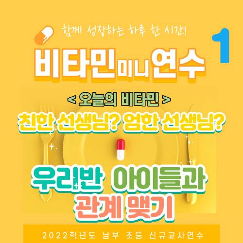 '신규교사 비타민 미니연수'는 교사 직무 수행 시 적용가능한 내용을 1시간 미니 연수로 진행하며 주 내용은 '우리 반 아이들과 관계 맺기', '행복한 우리 교실 꾸미기', '업무포털 사용법', '학부모 소통 꿀팁' 등이다.
