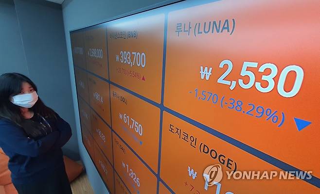 (서울=연합뉴스) 한상균 기자 = 13일 서초구 빗썸 고객센터 모습. 한국산 가상화폐 루나와 자매 스테이블 코인 테라USD(UST) 폭락으로 가상화폐 시장이 흔들리고 있다. 세계 최대 가상화폐 거래소 바이낸스는 이날 루나 상장 폐지를 결정했다. 비트코인은 9개월여 만에 4천만원 아래로 떨어졌다. 2022.5.13