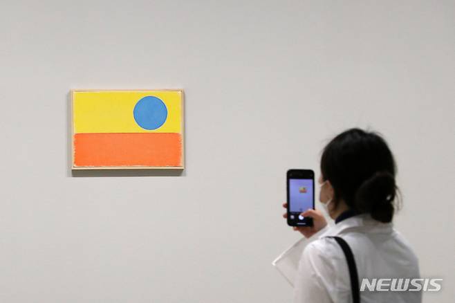 [부산=뉴시스] 박진희 기자 = 국제갤러리가 13일 부산 수영구 국제갤러리 부산점에서 우고 론디노네(Ugo Rondinone) 개인전 'nuns and monks by the sea' 작품 전시를 하고 있다. 부산 공간에 전시되는 17개의 작은 'mattituck' 연작 작품들을 전시되어 있다. 수채화 'mattituck' 연작은 전체적으로 다채로운 색을 담고 있지만, 각각의 작품은 오로지 3개의 색으로만 이루어진다. 단 3개의 색으로만 구성해서, 론디노네는 해가 수평선 아래로 지는 순간을 포착하고 노을의 섬세함을 화폭에 담아낸다. 2022.05.13. pak7130@newsis.com