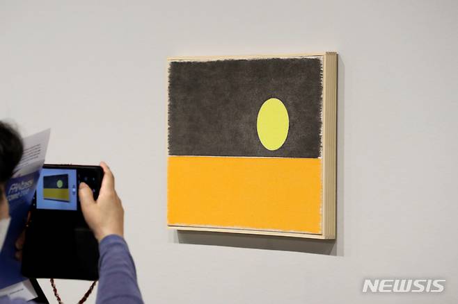 [부산=뉴시스] 박진희 기자 = 국제갤러리가 13일 부산 수영구 국제갤러리 부산점에서 우고 론디노네(Ugo Rondinone) 개인전 'nuns and monks by the sea' 작품 전시를 하고 있다. 부산 공간에 전시되는 17개의 작은 'mattituck' 연작 작품들을 전시되어 있다. 수채화 'mattituck' 연작은 전체적으로 다채로운 색을 담고 있지만, 각각의 작품은 오로지 3개의 색으로만 이루어진다. 단 3개의 색으로만 구성해서, 론디노네는 해가 수평선 아래로 지는 순간을 포착하고 노을의 섬세함을 화폭에 담아낸다. 2022.05.13. pak7130@newsis.com