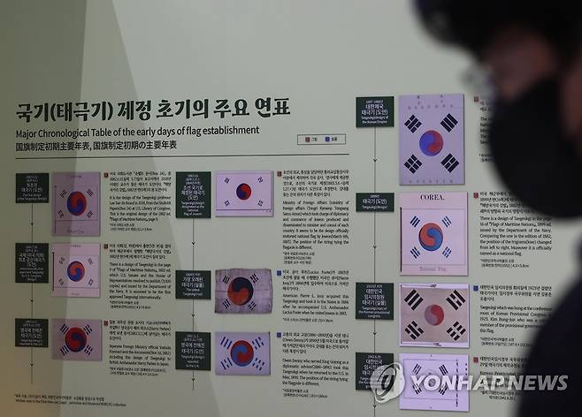 (서울=연합뉴스) 이재희 기자 = 13일 서울 종로구 대한민국역사박물관 로비에 현존 최고(最古)로 추정되는 태극기 도안 사본(왼쪽 위)이 공개됐다. 이태진 서울대 명예교수가 2017년 미국 의회도서관 슈펠트 문서에서 찾은 이 도안이 실린 보고서는 1882년 6월 11일에 작성됐다. 원본은 미 의회도서관에 있다. 2022.5.13