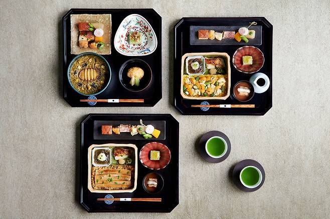 Abalone Ozen is a rice porridge dish made with carefully selected abalone from the waters off Wando Island. Eel Ozen is a donburi-style breakfast dish of sea eel, served on pot-steamed rice. Sea Urchin Roe Ozen features saffron-steamed rice topped with sea urchin roe, tofu skin and asparagus. Each breakfast dish is served with a selection of nine Japanese appetizers. Breakfast dishes are available from 7 a.m. to 10 a.m. on weekdays, by advance reservation only.