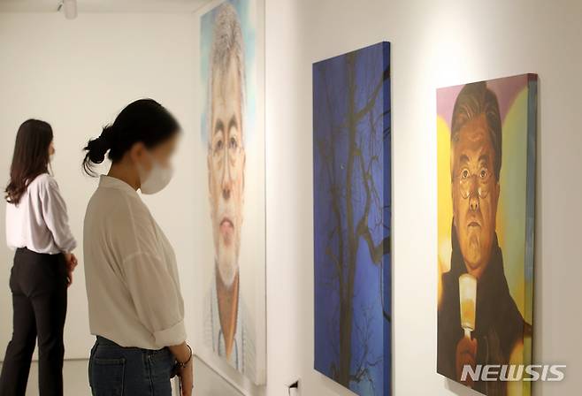[서울=뉴시스] 조성우 기자 = 13일 오후 서울 중구 로즈앤라임 갤러리에서 문재인 전 대통령에 대한 헌정을 주제로 열린 '문라이즈데이(Moon Rise Day)' 전시회에서 관람객들이 작품을 보고 있다. 2022.05.13. xconfind@newsis.com