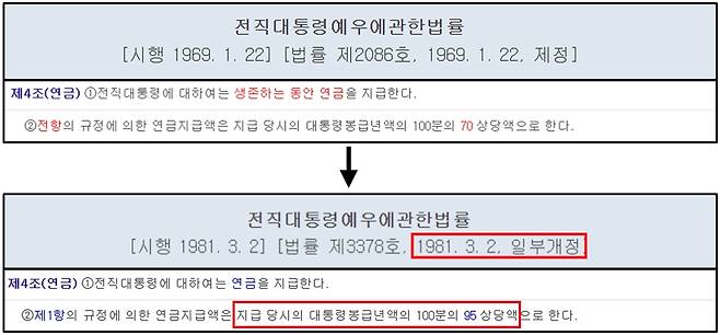 | ▲ 1981년 3월 2일 전직대통령법 개정으로 인상된 대통령 연금 |