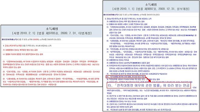 김순덕 대기자는 대통령 연금이 소득세법 제12조(비과세 소득)에서 "(3호 카목과 파목 사이에) 쏙 끼어 들어가 있다"며 "일부러 눈에 띄지 않게 (카)와 (파) 사이에 들어가 있는 건 아니었길 바란다"고 서술하기도 했는데요. 소득세법이 기사에 나온 것처럼 개정된 것은 2009년 12월 31일입니다.