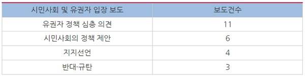 이번 모니터기간 동안 시민사회 및 유권자 입장 보도는 24건 보도되었다. 그 세부내용을 살펴보면, 유권자의 정책 심층의견이 11건, 시민사회의 정책제안이 6건, 지지선언 4건, 반대·규탄하는 내용 3건이 보도되었다.